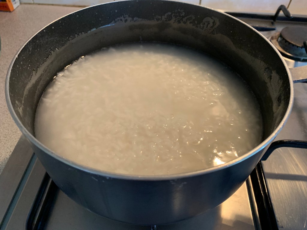 Step 5: Cooking time is a minimum 15 minutes but if you can leave it on a low heat for about 30 minutes then the rice will break further apart for better effect. End product should have a thin layer of gruel (cooked rice water) on top.